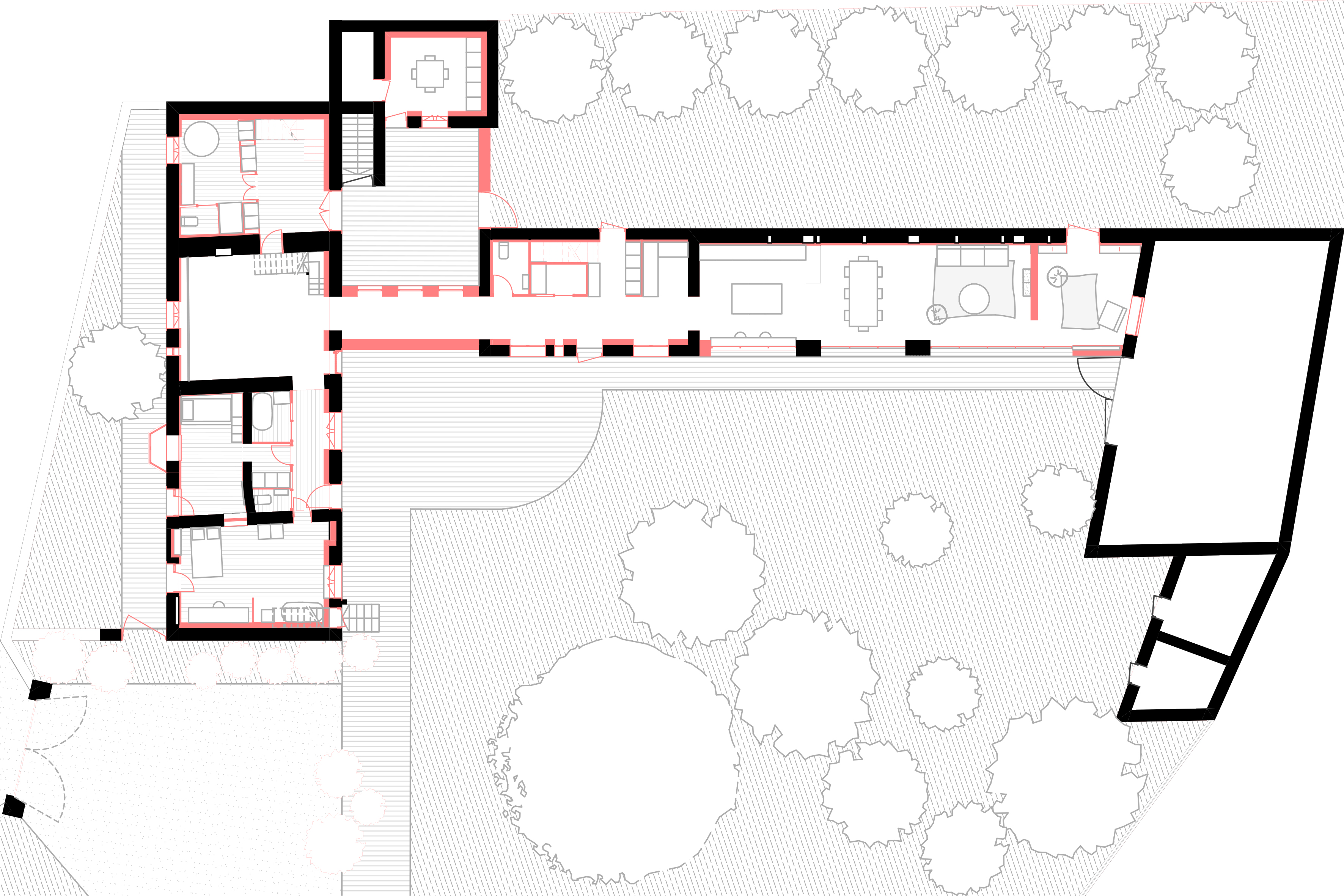 La posture architecturale se veut humble, cherchant une réponse adaptées afin de préserver l’atmosphère préexistante. En parallèle, le projet aspire à s’adapter aux modes d’habiter des nouveaux propriétaires, étant également dans le milieu du cinéma. La proposition prend racine dans la mise en place d’un parcours plus lisible au sein du site et en offrant des espaces de vie, davantage adaptés aux usages contemporains. Ainsi, tout en trouvant des résonances dans le passé et en essayant de respecter la mémoire des lieux, le projet défend les bénéfices de la restauration, du réemploi, de la transformation et de l’hybridation des éléments présents in situ.